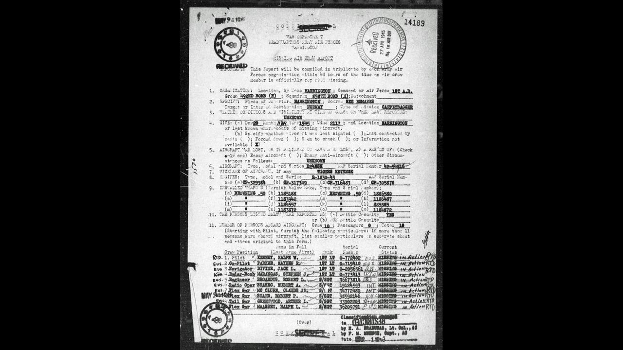Note: Lt Marangas left plane without parachute on back of S/Sgt Brabec but lost grip when chute opened falling to his death. Aircraft lost on Allied Forces special operations Page 532