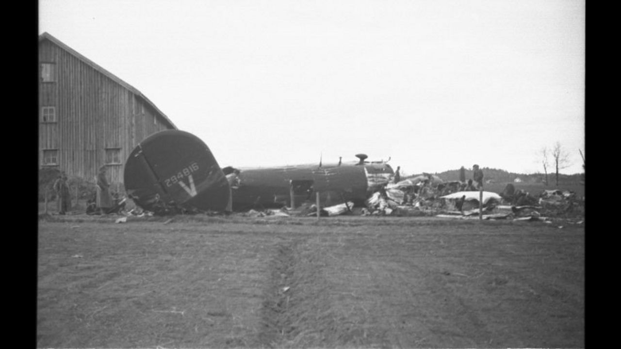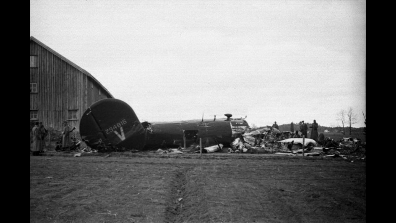 Mannskapet kastet seg ut i fallskjerm, og flyet gikk i bakken med et brak over gården Eikelund ved Hallevannet. Flyets Radar-Bombardier Stephen J. Marangas fant ikke sin fallskjerm og forsøkte en stund å klamre seg til en av de andre. Rykket som kom da fallskjermen åpnet seg var imidlertid så kraftig at Marangas ikke klarte å holde seg fast lengre, og dermed ble han drept i møtet med bakken. De andre ni overlevde landingen, selv om tre av amerikanerne brakk beina i landingsøyeblikket.