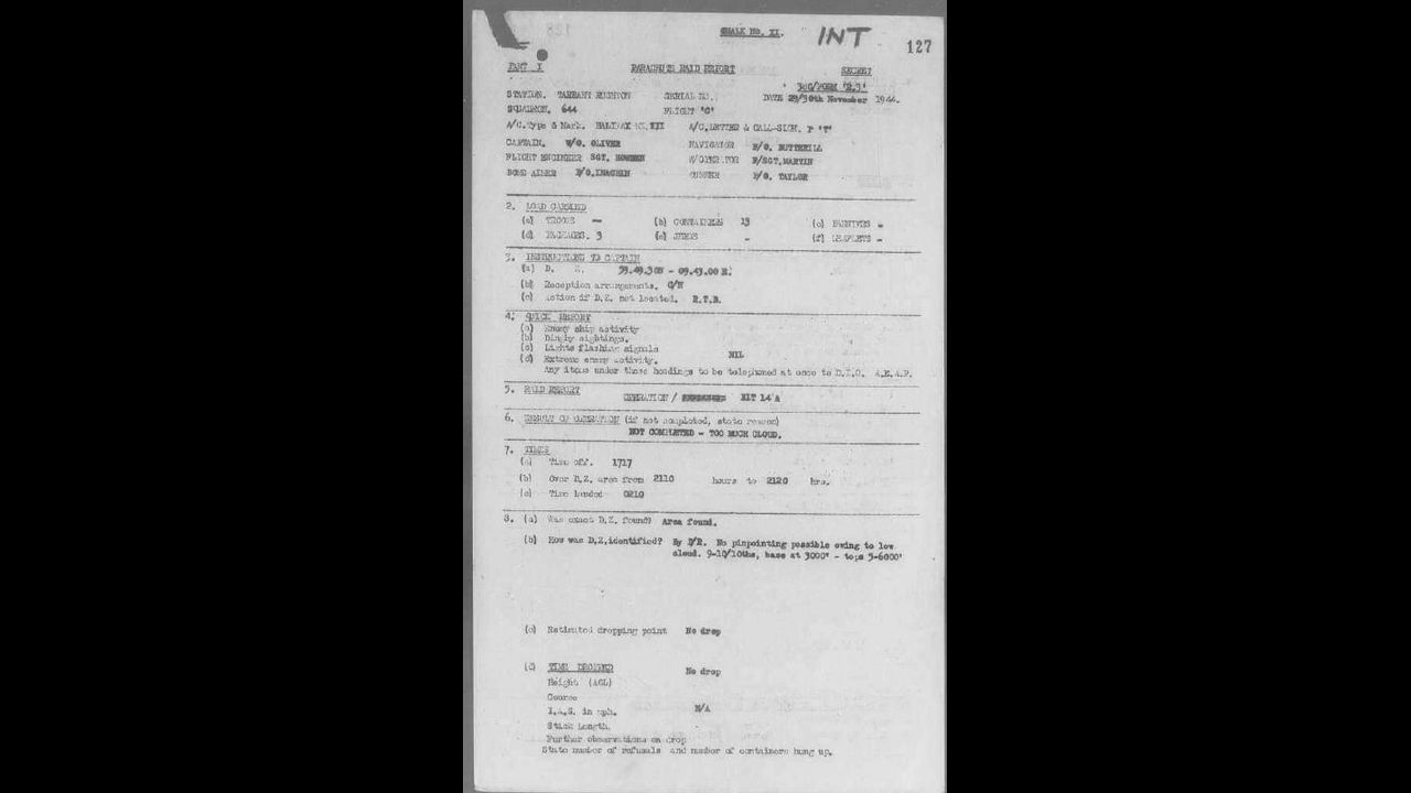 Nov 29th Halifax III MZ 959 17:15 02:15 SOE BIT 14 Load 13 containers 3 packages. Route Base - 5257N 0034E - 5803N 0710E - 5825N 0750E - 5942N 0912E - DZ (594930N 094500E) 5825N 0750E - then R.S.R. Operation unsucessful 10/10 3.000 ft cloud vis. downward nil. Cloud 10/10 6.000 ft. Area located by DR. no actual pinpoint found. No enemy activity, returned to base with load.