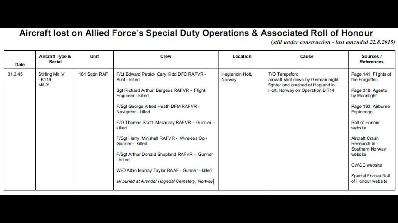 - 30/31 march 1945 Stirling "Y" BIT 14, Norway, Total 8:20 hrs. 21:00 05:30. Aircraft failed to return. Personel reported missing wef. 31 March 1945. Missing